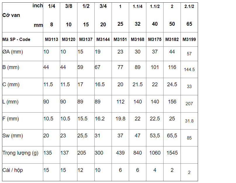 - Kích thước phi cho van bi đồng tay gạt MIHA – gas: DN8(phi 8) – DN50(phi 50)