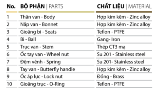 Thông số kỹ thuật van bi tay bướm mạ TUBO